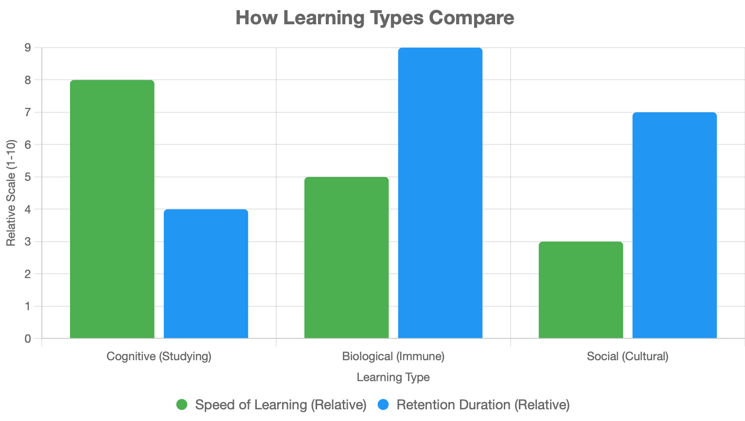The green bars show how fast each type of learning happens, rated from 1 to 10. Cognitive learning, like studying, is quick, scoring an 8 because you can grasp concepts in hours or days with focus. Biological learning, like your immune system adapting, is slower, around a 5, since it takes time for cells to adjust and create lasting changes. Social learning, like absorbing cultural habits, is even slower, at a 3, because it often unfolds over months or years through observation and practice.